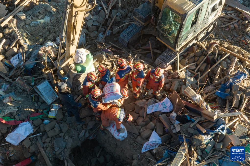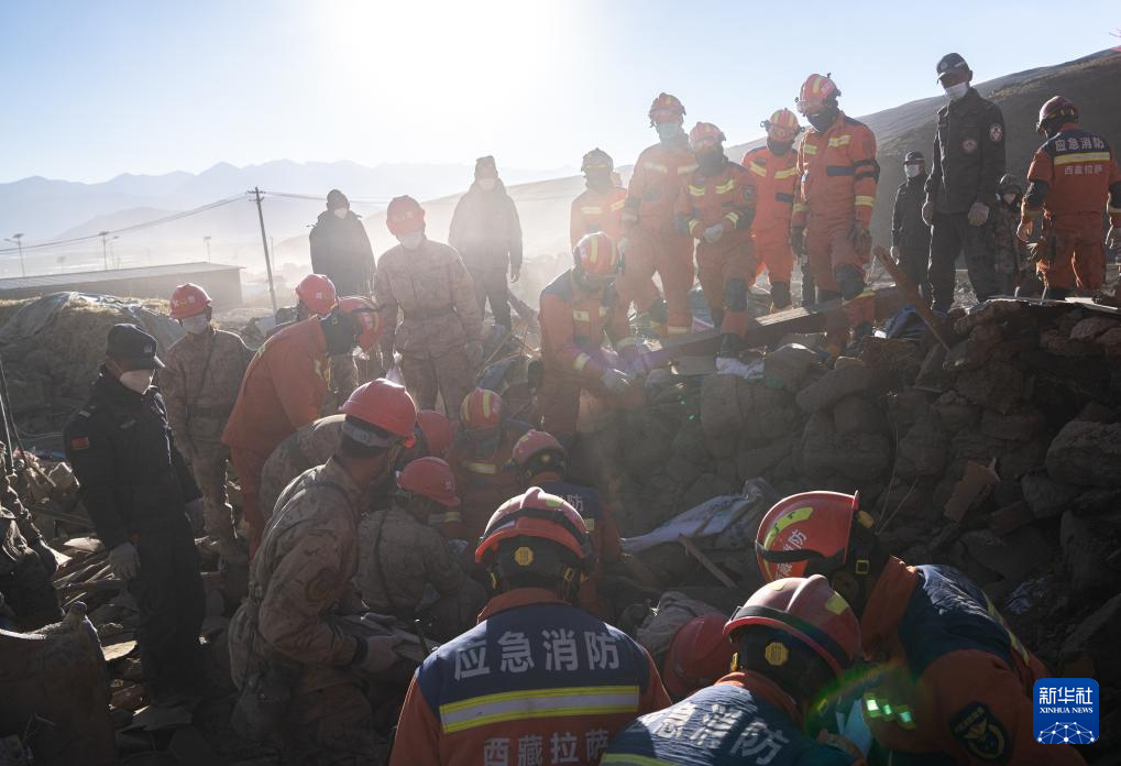 1月13日,在定日縣長所鄉(xiang) 古榮村,消防員、武警官兵和公安幹警在搜尋次仁紮西老人家裏的青稞。新華社記者 丁增尼達 攝