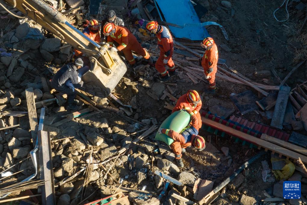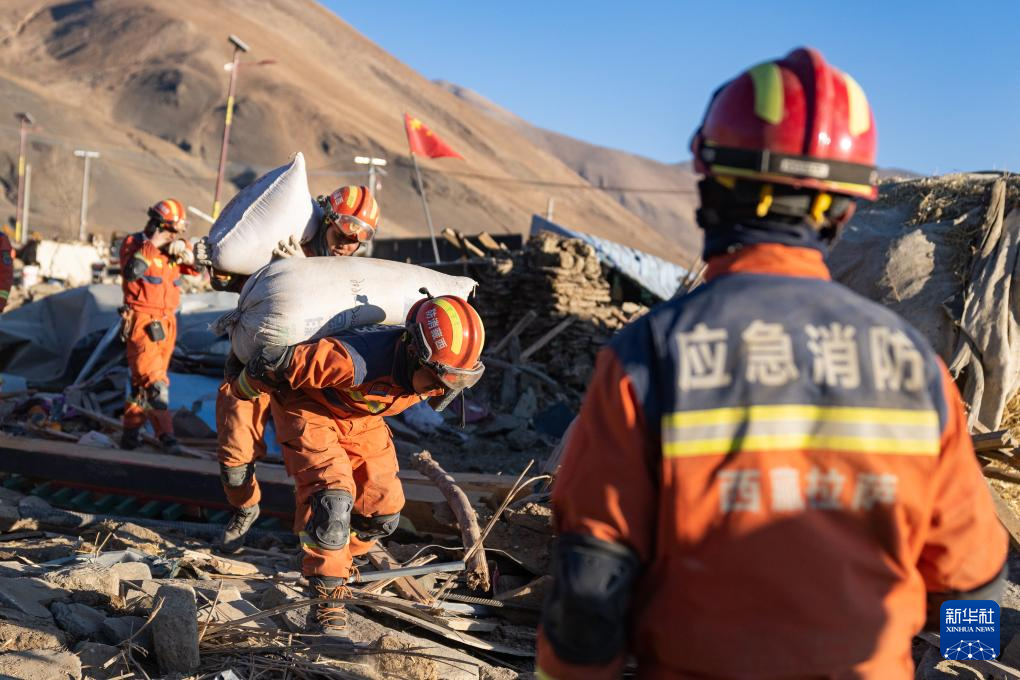 1月13日,在定日縣長所鄉(xiang) 古榮村,消防員在搬運搶救出來的青稞。新華社記者 丁增尼達 攝