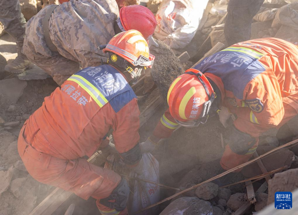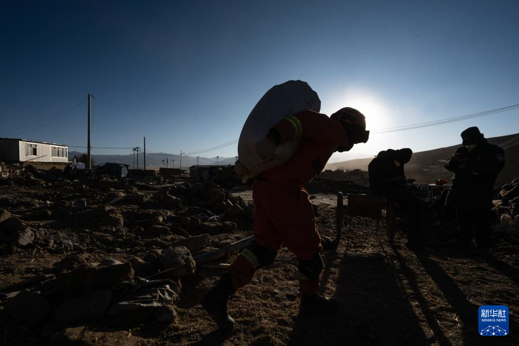 1月13日,在定日縣長所鄉(xiang) 古榮村,消防員在搜尋次仁紮西老人家裏的青稞。新華社記者 丁增尼達 攝
