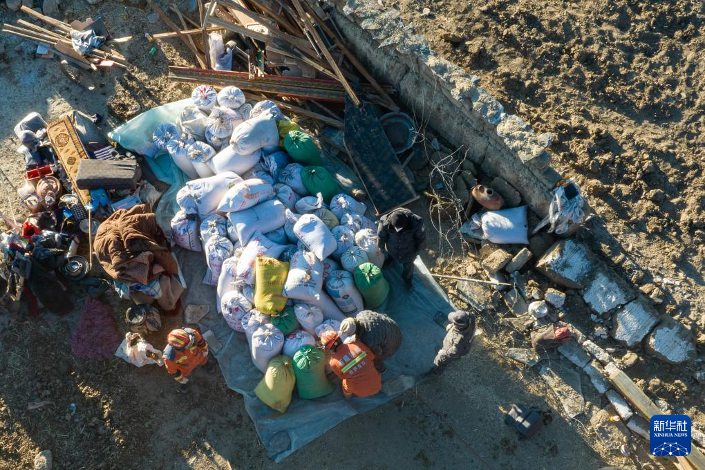 1月13日,在定日縣長所鄉(xiang) 古榮村,搶救出的70多袋青稞堆放在角落(無人機照片)。新華社記者 丁增尼達 攝
