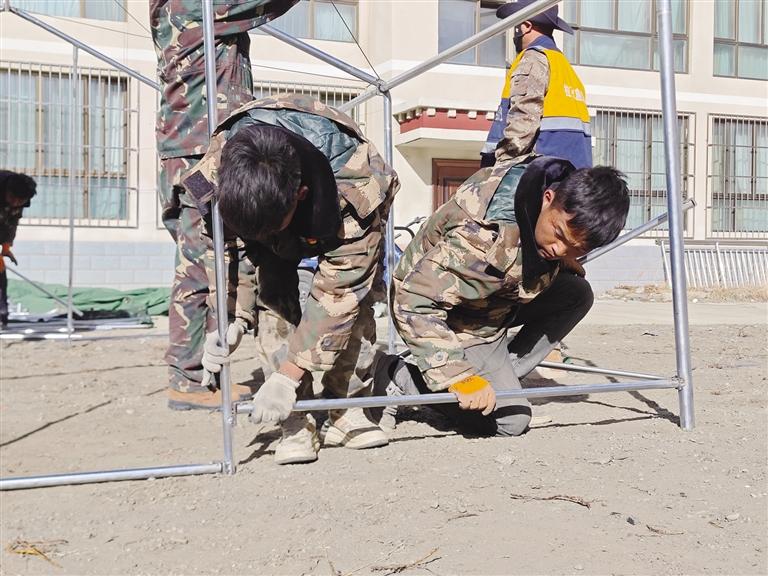 來自日喀則市江孜縣的次仁加措,雖然年僅(jin) 23歲,眼神中透露出一種不容置疑的堅定。他一邊熟練地搭著帳篷,一邊說:“我們(men) 是軍(jun) 人,哪怕退伍了,這份責任也永遠在肩上。”一旁,普瓊達瓦正在卸載著救援物資,汗水從(cong) 他的額頭滑落到塵土中。次仁旺加和邊巴紮西則在一旁協助搭建帳篷。他們(men) 的雙手早已磨出了紅印,但手中的活卻一刻也沒有停下。