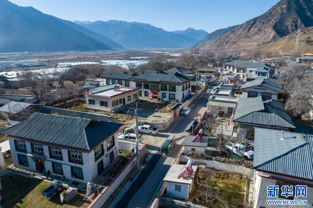 1月19日,西藏林芝市“郵快合作”新配備的郵遞車穿行在鄉(xiang) 村小巷(無人機照片)。新華網 旦增努布 攝