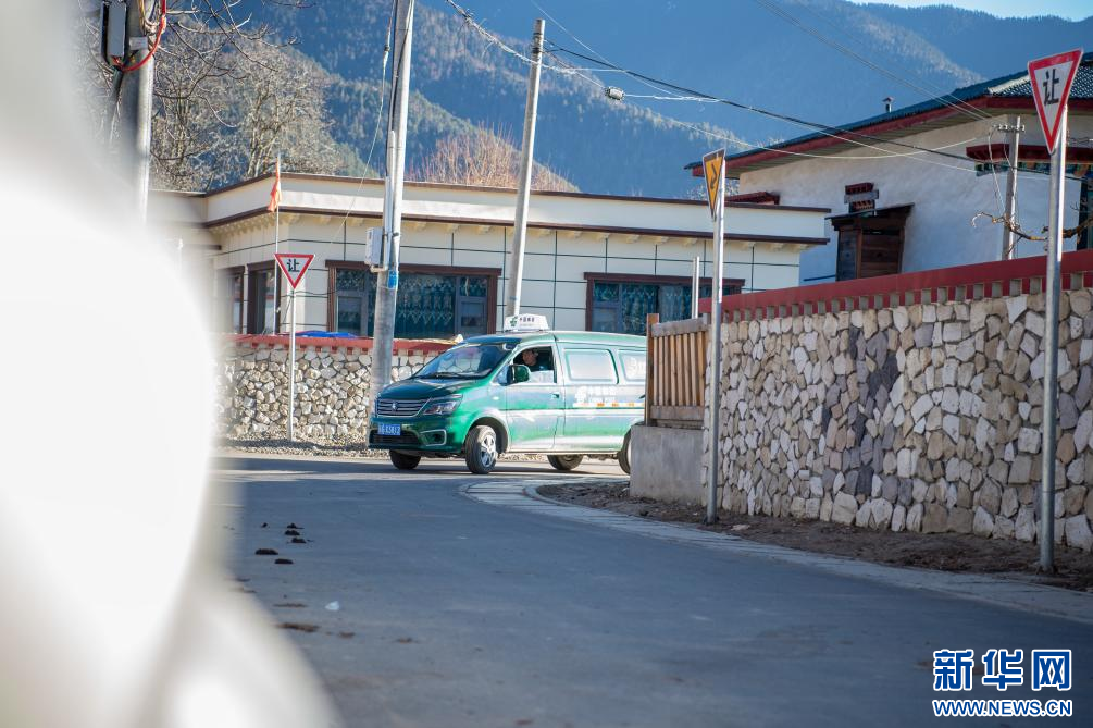 1月19日,西藏林芝市“郵快合作”新配備的郵遞車穿行在鄉(xiang) 村小巷。新華網 旦增努布 攝