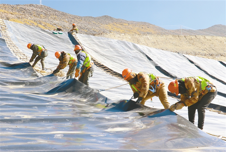 中鐵十七局集團第二工程有限公司西藏巨龍德慶普項目現場工人正在拉薩市達孜區海拔5000米以上的施工區域進行鋪膜防滲作業(ye) 。