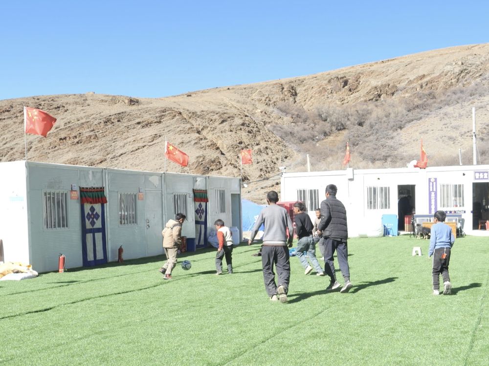 1月27日,在定日縣長所鄉(xiang) 古榮村板房安置點,孩子們(men) 正在踢足球。(受訪者供圖)