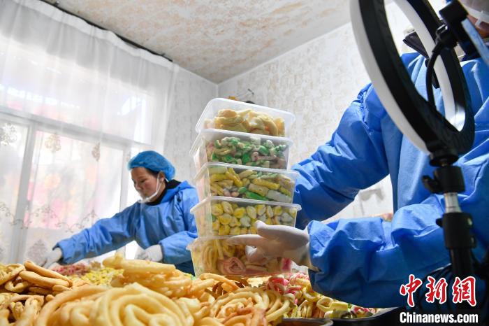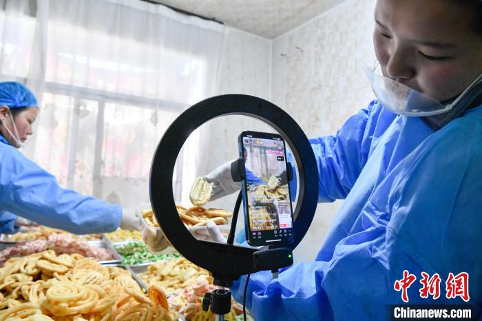 2月10日,西藏拉薩市林廓北路一家卡塞店裏,工人在直播賣卡塞。“卡塞”是一種油炸麵食,是藏曆新年必不可少的食物。隨著藏曆新年的日益臨(lin) 近,古城拉薩各個(ge) 加工銷售“卡塞”的店鋪飄出陣陣香味。中新社記者 貢嘎來鬆 攝