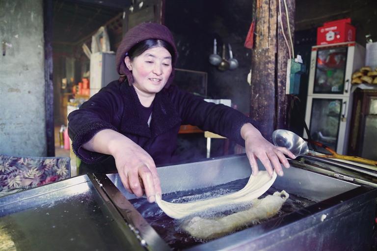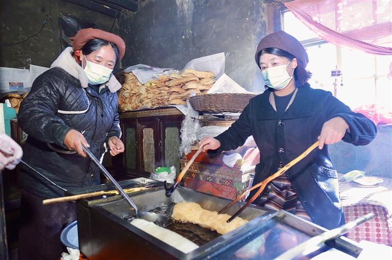“德卡”,作為(wei) 傳(chuan) 統藏式點心“卡塞”的一種,在藏曆新年的年貨清單裏占據著不可或缺的位置。每到藏曆新年前夕,旦索朗一家便進入了一年中最忙碌的時段——經營起製作和售賣卡塞的生意。旦索朗回憶起小時候的新年,感慨萬(wan) 分:“小時候過年,家家戶戶都自己炸卡塞,那時候,整個(ge) 村子都被卡塞的濃香包圍著。現在生活條件好了,很多人覺得在外購買(mai) 德卡更方便省事,這也給我們(men) 帶來了商機。我們(men) 做炸德卡的生意已經6年了,一直都很受歡迎,還帶動了6名村民一起參與(yu) ,增加了大家的收入。”