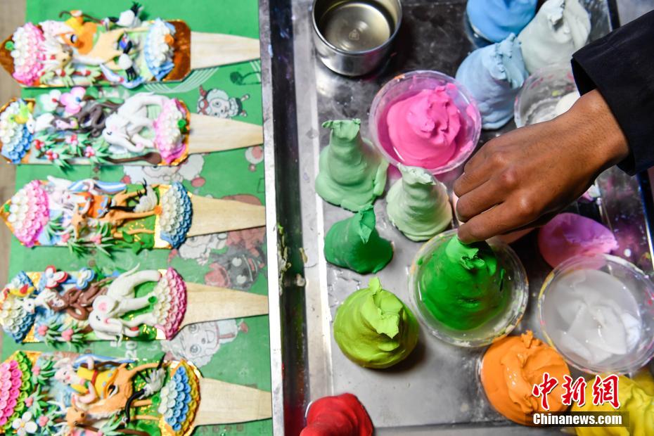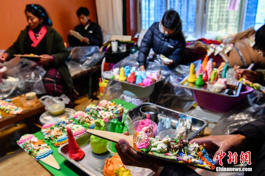2月15日,手工藝人在拉薩製作酥油花。隨著藏曆新年臨(lin) 近,酥油花在拉薩年貨市場上熱銷。酥油花在藏語中稱為(wei) “孜紮”,是藏族民眾(zhong) 家庭中必備的年貨之一。中新社記者 貢嘎來鬆 攝