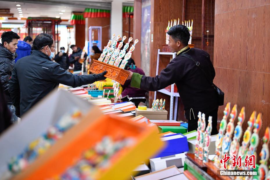 2月15日,拉薩市民在八廓商城選購年貨酥油花。隨著藏曆新年臨(lin) 近,酥油花在拉薩年貨市場上熱銷。酥油花在藏語中稱為(wei) “孜紮”,是藏族民眾(zhong) 家庭中必備的年貨之一。