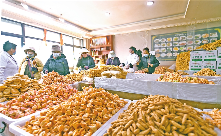 隨著藏曆新年日益臨(lin) 近,拉薩街頭巷尾各種琳琅滿目的“藏式”年貨,讓年味兒(er) 越來越濃,而構成這年味兒(er) 最重要的元素之一就是“卡賽”的香味兒(er) 。“卡賽”是一種油炸麵食,是藏曆新年必不可少的食物。藏曆新年前夕,古城拉薩各個(ge) 加工銷售“卡賽”的店鋪飄出陣陣香味。