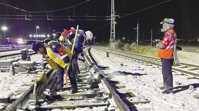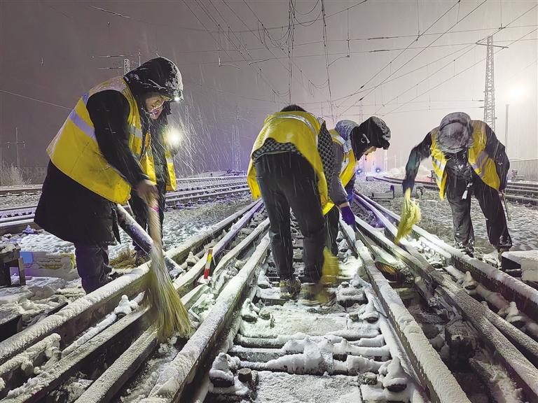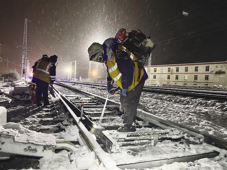 “我們(men) 繼續往前走,檢查下一組道岔。”盡管他們(men) 的眉毛、睫毛上都結滿了冰晶,但這並不能阻擋大家迎戰風雪、護航春運的堅定步伐。7時30分,經過長達300分鍾緊張有序的作業(ye) ,拉薩西貨場道岔積雪終於(yu) 清理完畢。