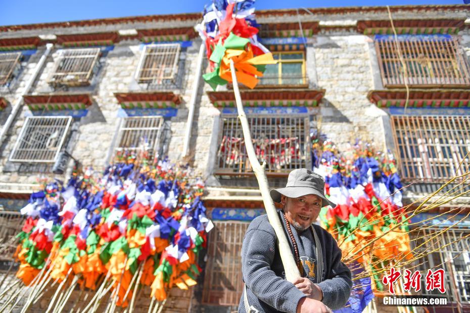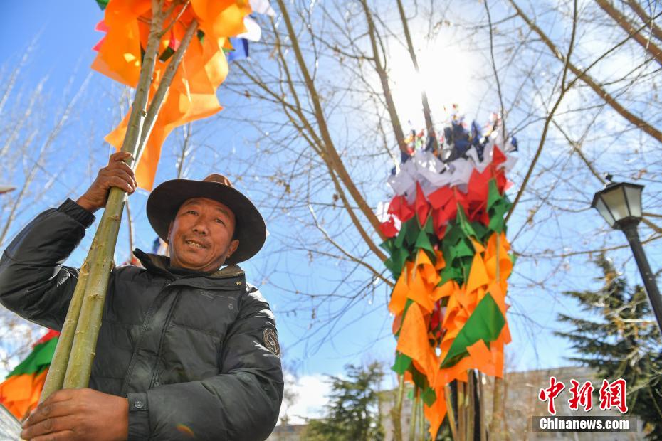 臨(lin) 近藏曆新年,2月16日,在西藏拉薩街頭,農(nong) 牧民正縫製五彩經幡樹。五彩經幡樹是藏族民眾(zhong) 在藏曆新年前必備的年貨之一。藏曆新年期間,藏族民眾(zhong) 會(hui) 選擇一個(ge) 良辰吉日,為(wei) 自家的房頂更換五彩經幡樹,祈求新的一年裏五穀豐(feng) 登,吉祥如意。圖為(wei) 2月16日,來自尼木縣的普瓊扛著五彩經幡樹。貢確 攝