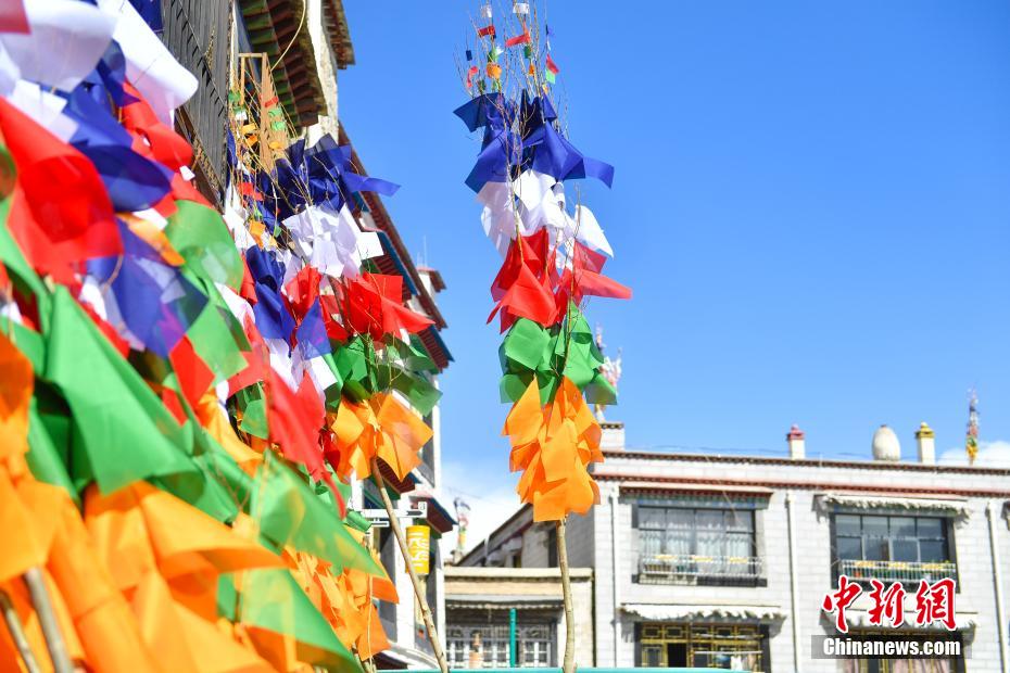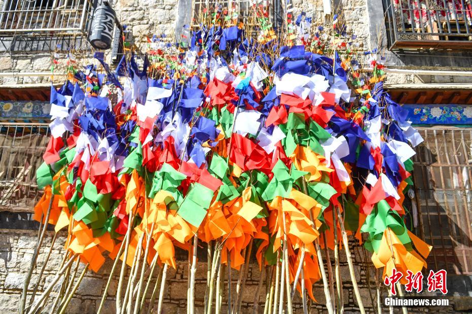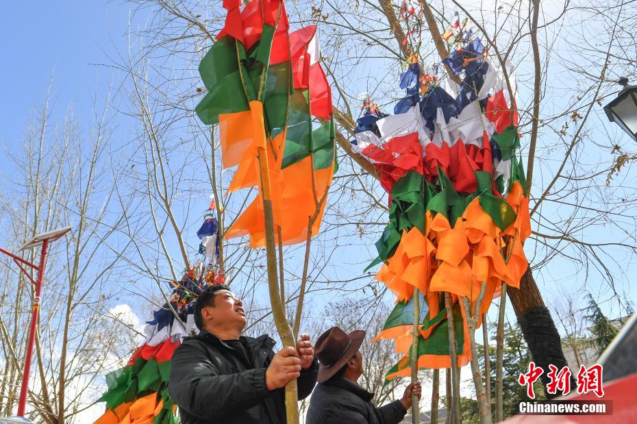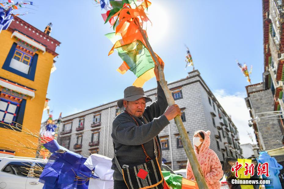 臨(lin) 近藏曆新年,2月16日,在西藏拉薩街頭,農(nong) 牧民正縫製五彩經幡樹。五彩經幡樹是藏族民眾(zhong) 在藏曆新年前必備的年貨之一。藏曆新年期間,藏族民眾(zhong) 會(hui) 選擇一個(ge) 良辰吉日,為(wei) 自家的房頂更換五彩經幡樹,祈求新的一年裏五穀豐(feng) 登,吉祥如意。圖為(wei) 2月16日,拉薩市民正在挑選購買(mai) 五彩經幡樹。貢確 攝