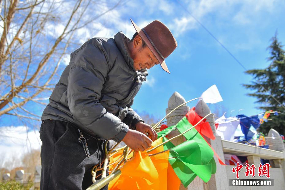 臨(lin) 近藏曆新年,2月16日,在西藏拉薩街頭,農(nong) 牧民正縫製五彩經幡樹。五彩經幡樹是藏族民眾(zhong) 在藏曆新年前必備的年貨之一。藏曆新年期間,藏族民眾(zhong) 會(hui) 選擇一個(ge) 良辰吉日,為(wei) 自家的房頂更換五彩經幡樹,祈求新的一年裏五穀豐(feng) 登,吉祥如意。圖為(wei) 2月16日,頓珠正在縫製五彩經幡樹。貢確 攝