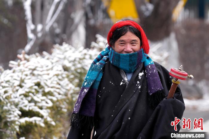 2月19日,西藏拉薩經過持續降雪,城市四周白雪皚皚。雪山、建築相映成景、風光秀麗(li) 。圖為(wei) 2月19日,信眾(zhong) 在雪後的宗角祿康公園轉經。中新社記者 李林 攝