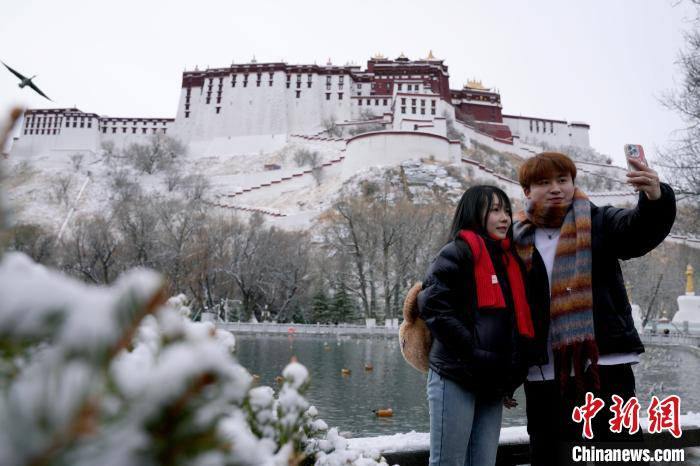 2月19日,西藏拉薩經過持續降雪,城市四周白雪皚皚。雪山、建築相映成景、風光秀麗(li) 。圖為(wei) 2月19日,遊客在布達拉宮腳下的宗角祿康公園拍照留念。中新社記者 李林 攝