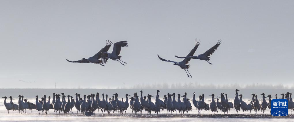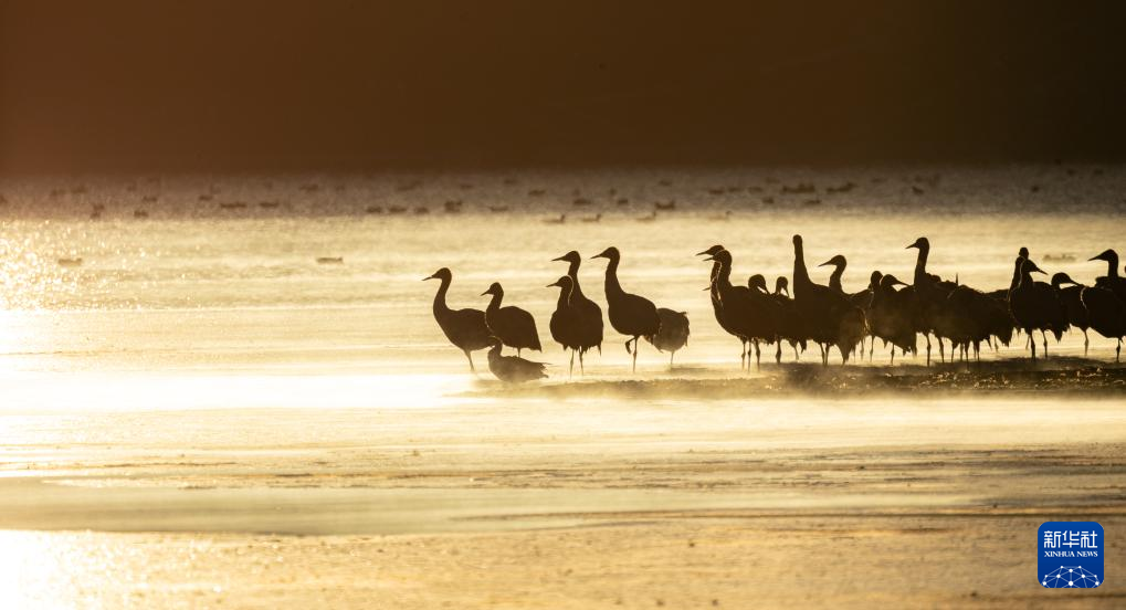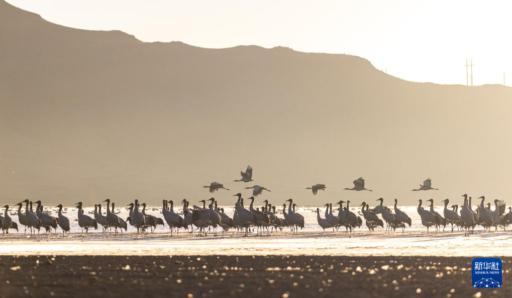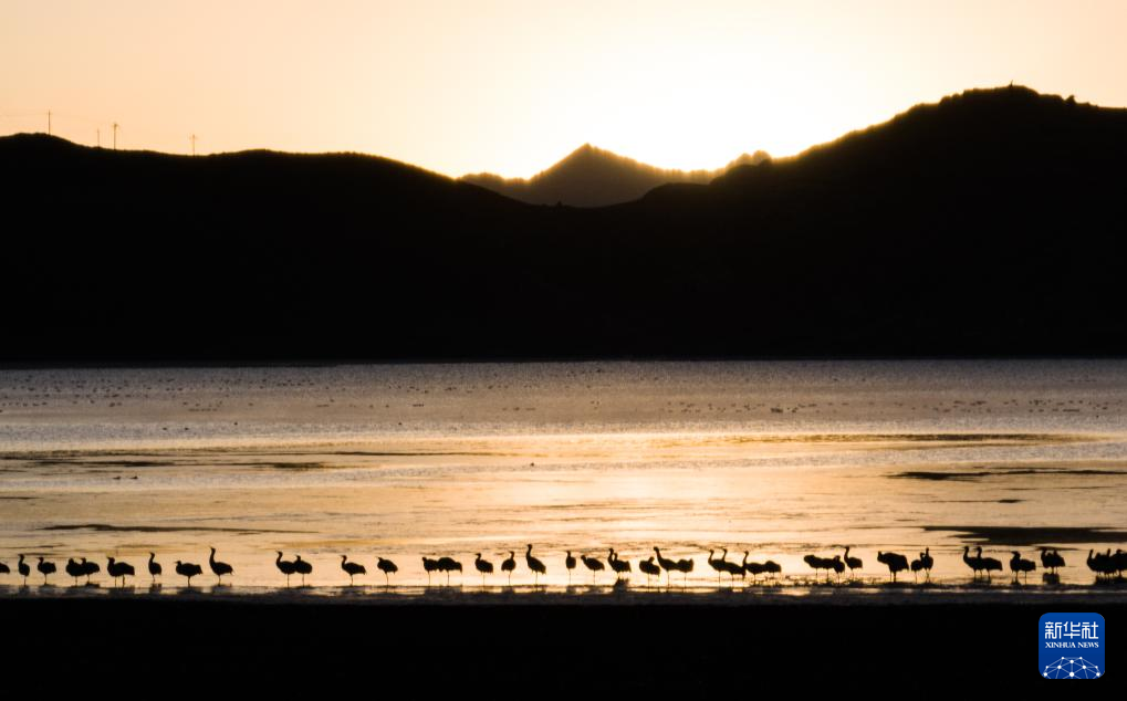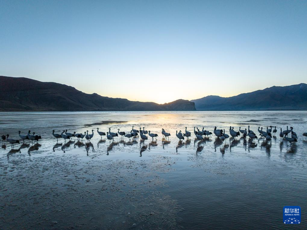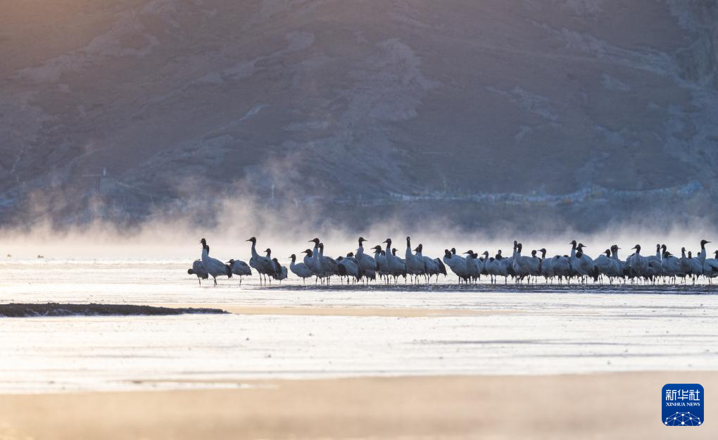 拉薩北部的林周縣平均海拔約4200米,是黑頸鶴的主要越冬地之一。清晨的陽光灑在林周縣虎頭山水庫,水麵波光粼粼,鶴影婀娜多姿。