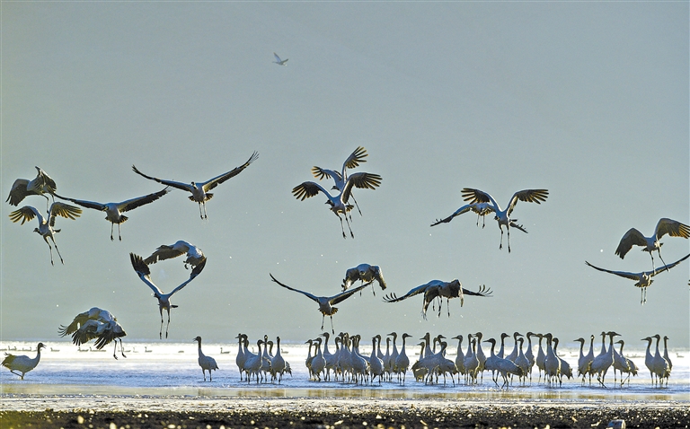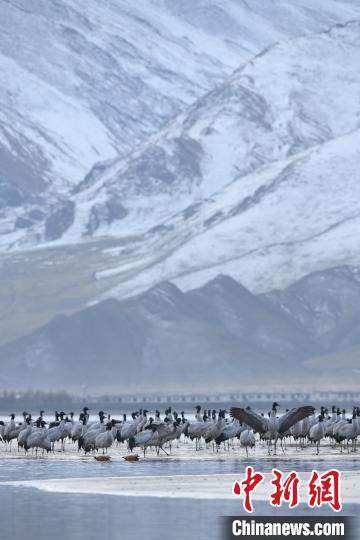 圖為(wei) 拉薩林周縣虎頭山水庫,黑頸鶴正在覓食、嬉戲。貢嘎來鬆 攝
