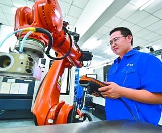 河北廊坊一家公司的工作人員在操作機器人。新華社發