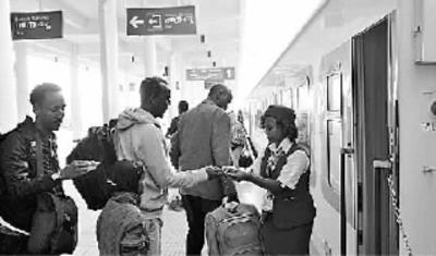 由中國企業(ye) 采用全套中國標準和中國裝備建造的非洲第一條跨國現代電氣化鐵路——亞(ya) 吉鐵路於(yu) 2018年1月正式投入商業(ye) 運營。圖為(wei) 3月25日,在埃塞俄比亞(ya) 首都亞(ya) 的斯亞(ya) 貝巴,列車員在亞(ya) 吉鐵路拉布車站檢票。新華社發