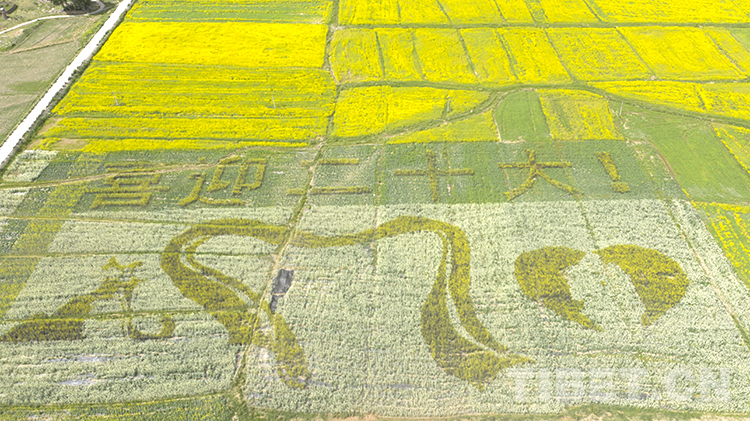 值得一提的是,在紮西崗鄉(xiang) 主會(hui) 場,當地將荒地重新開墾,安排種植了油菜花大地景觀。不同品種、不同顏色的油菜花海為(wei) 背景的種植,從(cong) 空中俯瞰形成了“喜迎二十大”“鬆讚故裏 幸福墨竹”字樣和鬆讚幹布、文成公主、哈達、愛心等圖樣,表達當地群眾(zhong) 喜迎黨(dang) 的二十大的美好祝福。