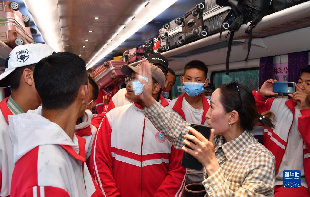 7月17日,拉薩那曲第三高級中學高一(15)班班主任次仁曲珍(右二)在車廂裏向學生們(men) 囑咐注意事項。新華社記者 覺果 攝