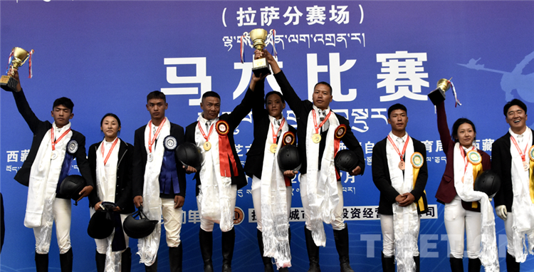 圖為(wei) 7月17日競技馬術項目場地障礙團體(ti) 賽頒獎現場(中間為(wei) 冠軍(jun) 日喀則市代表團,左邊為(wei) 亞(ya) 軍(jun) 那曲市代表團,右邊為(wei) 季軍(jun) 昌都市代表團) 攝影:德吉卓嘎
