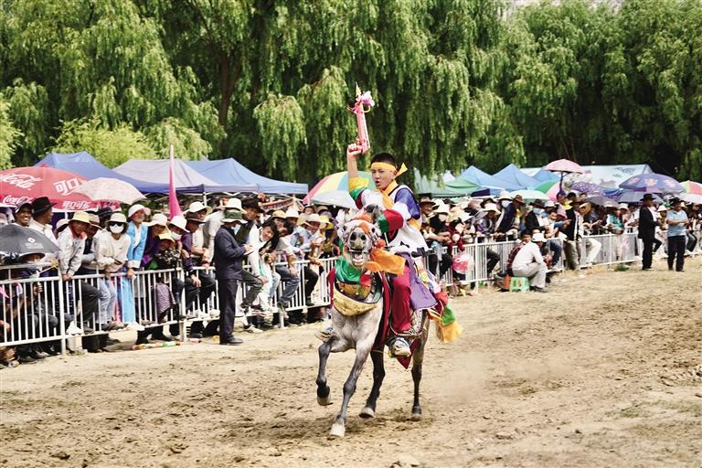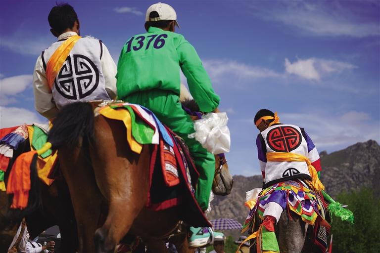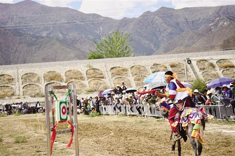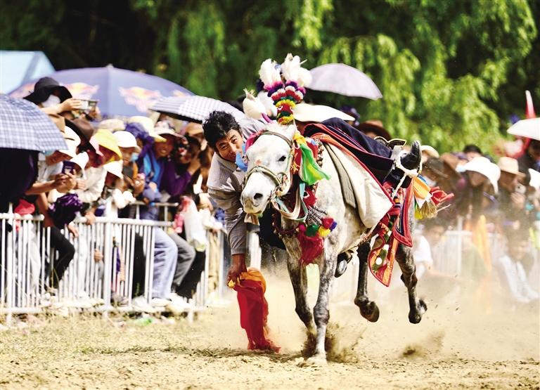 當日上午11時,茶巴朗村望果節賽馬正式開始,騎手們(men) 身著傳(chuan) 統服飾,戴著紅纓帽,身背彎弓,騎著打扮華麗(li) 的駿馬,進行了4000米速度賽馬、拾哈達、射箭、馬術等精彩比賽。現場,觀眾(zhong) 揮舞手臂為(wei) 選手們(men) 鼓勁呐喊。馳騁在賽場上,選手的吆喝聲伴著觀眾(zhong) 的呐喊聲在賽場上空匯聚。