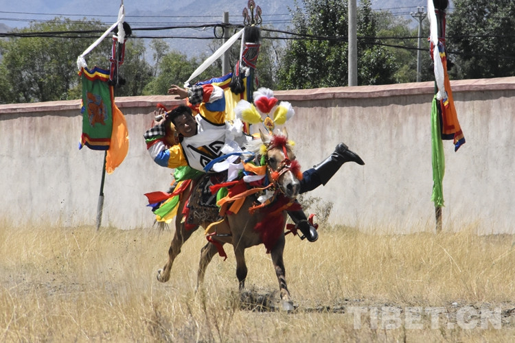圖為(wei) 一名騎手在表演馬上拾哈達 攝影:拉姆