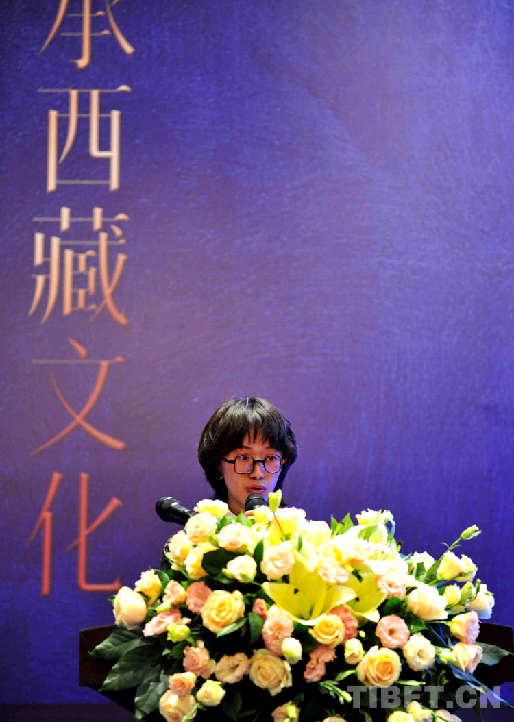 圖為(wei) 第九屆“地球第三極·西藏禮物”旅遊文創商品大賽頒獎儀(yi) 式現場銀獎獲得者——西藏三界文化發展有限公司的格桑卓瑪作為(wei) 獲獎代表進行發言攝影:拉姆