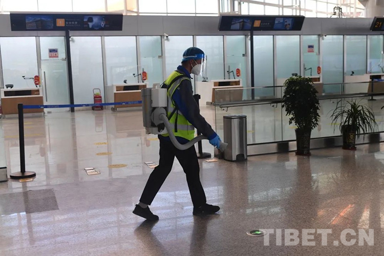 圖為(wei) 拉薩貢嘎機場工作人員正在消毒 圖片由民航西藏自治區管理局提供
