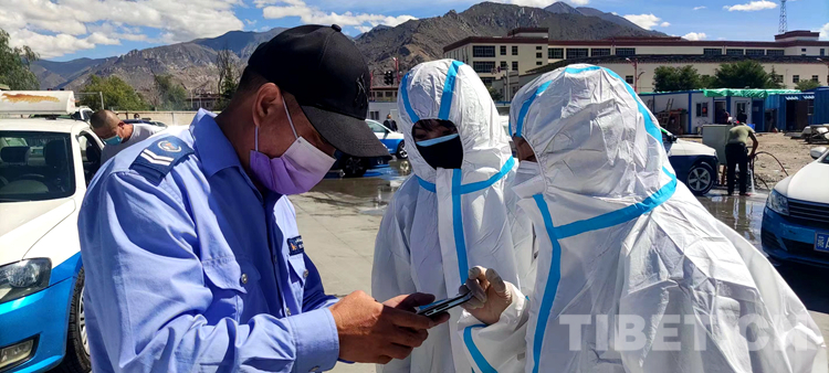 圖為(wei) 在拉薩貢布堂路出租車洗車消毒點,出租車駕駛員和兩(liang) 位防疫誌願者交流核酸檢測結果查詢 攝影:趙良發