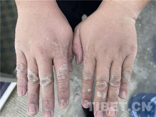 摘下戴了十幾個(ge) 小時的手套,每根手指都被捂皺變形,關(guan) 節處的皮膚泛白腫脹——看到日喀則邊境管理支隊吉隆邊境派出所民警桂浩的手部照片,讓人不禁淚目。