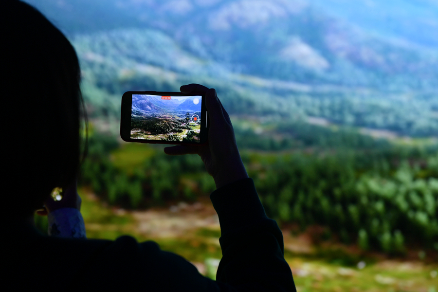 參觀者在祁連山國家公園青海片區展陳中心內(nei) 的球幕影院拍攝。