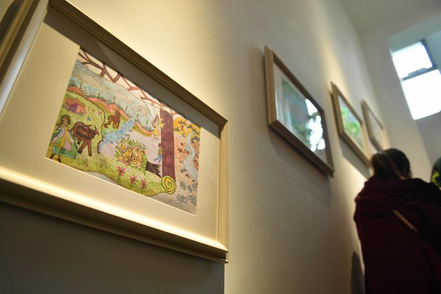 圖為(wei) 祁連山國家公園青海片區展陳中心內(nei) 展出的兒(er) 童繪畫作品。
