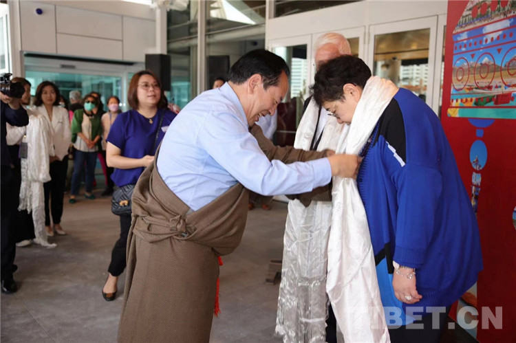 活動中,班覺才仁會(hui) 長為(wei) 鄧先生獻上哈達,祝福這次展出圓滿成功!