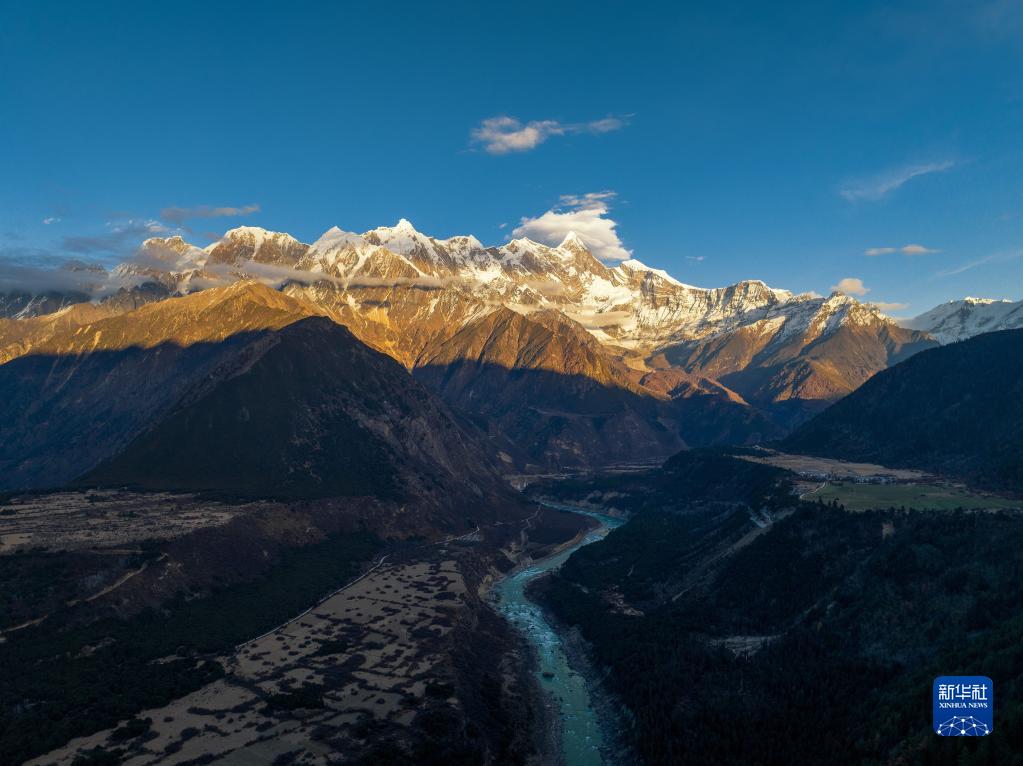 南迦巴瓦峰和山腳下的村莊(11月28日攝,無人機照片)。新華社發(董誌雄 攝)