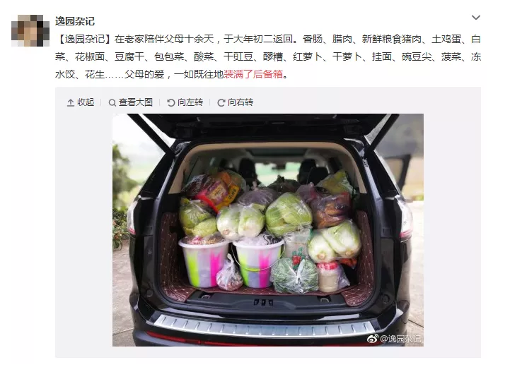 昨日,遊子們(men) 從(cong) 家這個(ge) 港灣裏,鳴笛啟航,奔向遠方。除了對鄉(xiang) 愁的百轉千回,更有親(qin) 情的濃鬱化不開。這幾天,網友們(men) 都在微博裏曬圖,“媽媽給裝的後備箱”的話題,一時成了熱點——“親(qin) 手做的馬蹄糕”“最愛的家鄉(xiang) 小柚柑”“一大罐子土榨花生油”“秋天醃的糖蒜”……後備箱被爸媽塞得滿滿的,不願帶還不高興(xing) 。於(yu) 是乎,調皮的網友留言:“明年我開個(ge) 貨車回來過年!”