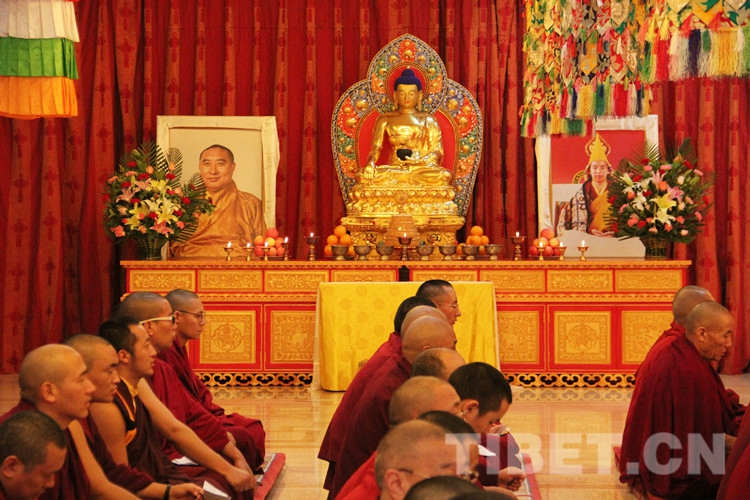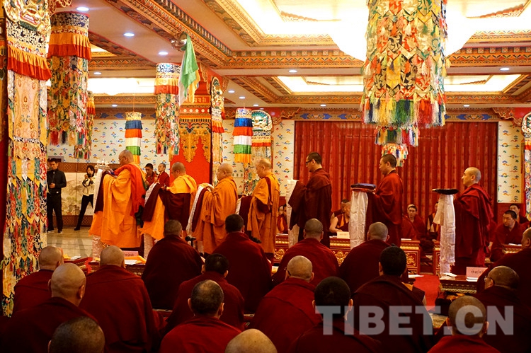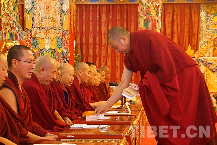 十一世班禪端坐於(yu) 法座之上,口念經文,百餘(yu) 位僧人身著戒衣,按順序分坐於(yu) 大殿兩(liang) 側(ce) ,跟隨大師虔誠詠誦《皈依發心》《文殊師利名讚》《十世班禪大師功德新祈禱詞》《回向祈禱詞》《十一世班禪大師常住世間法》《白度母讚》《釋教昌盛祈願》以及《興(xing) 隆正法》《消除眾(zhong) 劫》《六時吉祥》等。全場如律如儀(yi) ,梵音低徊,給人以安定的力量,場麵殊勝吉祥。