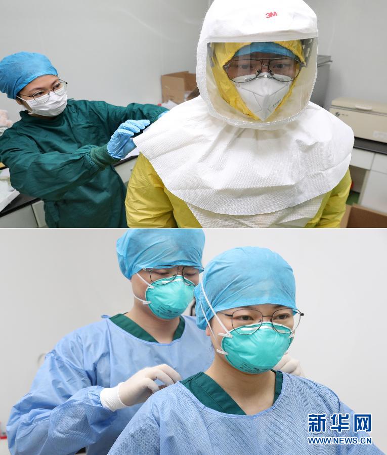 這張拚版照片顯示的是:2月25日,江蘇省南通市疾控中心病原微生物實驗室的檢測人員郭陳(左)在清潔區幫助丈夫季霄雷穿防護服、戴正壓麵罩(上);4月26日,季霄雷(左)幫助郭陳穿防護服(下)。“五一”前夕,江蘇省南通市疾控中心病原微生物實驗室檢測組的90後黨(dang) 員季霄雷和妻子郭陳以及其他同事依然堅守在疫情防控第一線。 新華社發(許叢(cong) 軍(jun) 攝)