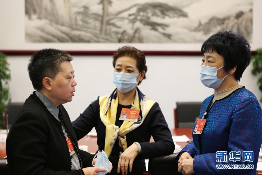 3月6日,十三屆全國人大四次會(hui) 議天津代表團的孔曉豔代表(左)、關(guan) 牧村代表(中)和馬傑代表在會(hui) 議間隙交流討論。新華社記者 吳雨 攝