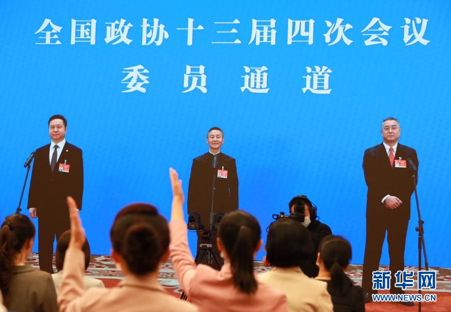 3月10日,全國政協十三屆四次會(hui) 議在北京人民大會(hui) 堂新聞發布廳舉(ju) 行第三場“委員通道”采訪活動。這是記者(屏幕中手持話筒者)通過網絡視頻方式提問。新華社記者 王南 攝
