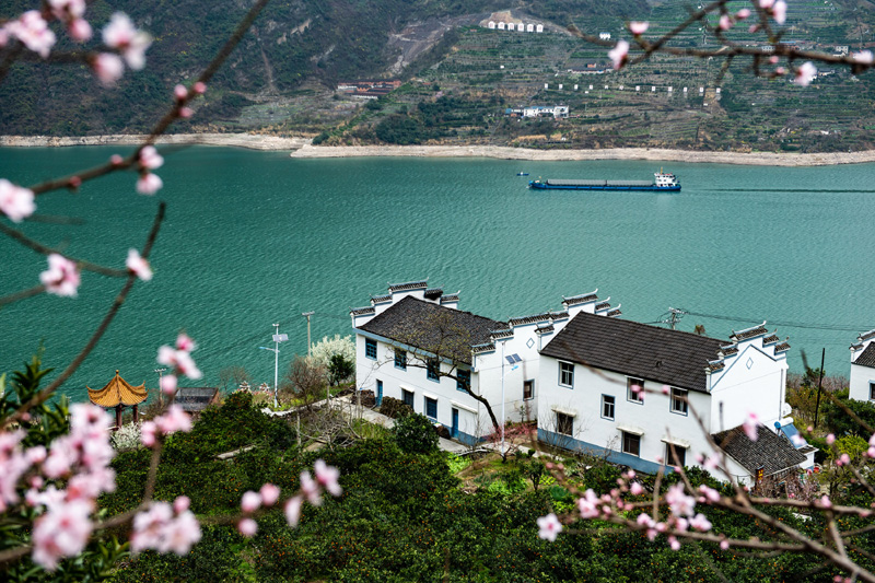 這是2021年2月27日在三峽庫區秭歸縣屈原鎮西陵峽村拍攝的鮮花盛開的臍橙園。湖北省宜昌市秭歸縣在建設美麗(li) 鄉(xiang) 村中,因地製宜,在臍橙園裏種植桃樹、李樹等果樹。