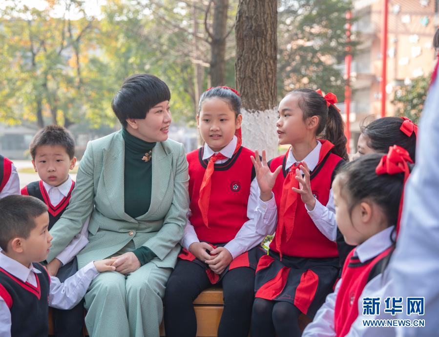 2月21日,在重慶市九龍坡區謝家灣小學,劉希婭(左三)在校園內(nei) 與(yu) 學生們(men) 聊天。新華社記者 黃偉(wei) 攝