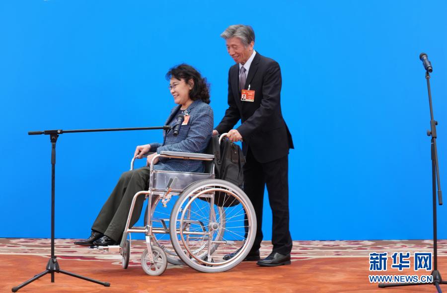 3月4日,全國政協十三屆四次會(hui) 議第一場“委員通道”采訪活動在北京人民大會(hui) 堂新聞發布廳舉(ju) 行。這是采訪活動結束後,全國政協委員範迪安推著全國政協委員張海迪離開會(hui) 場。新華社記者 李賀 攝