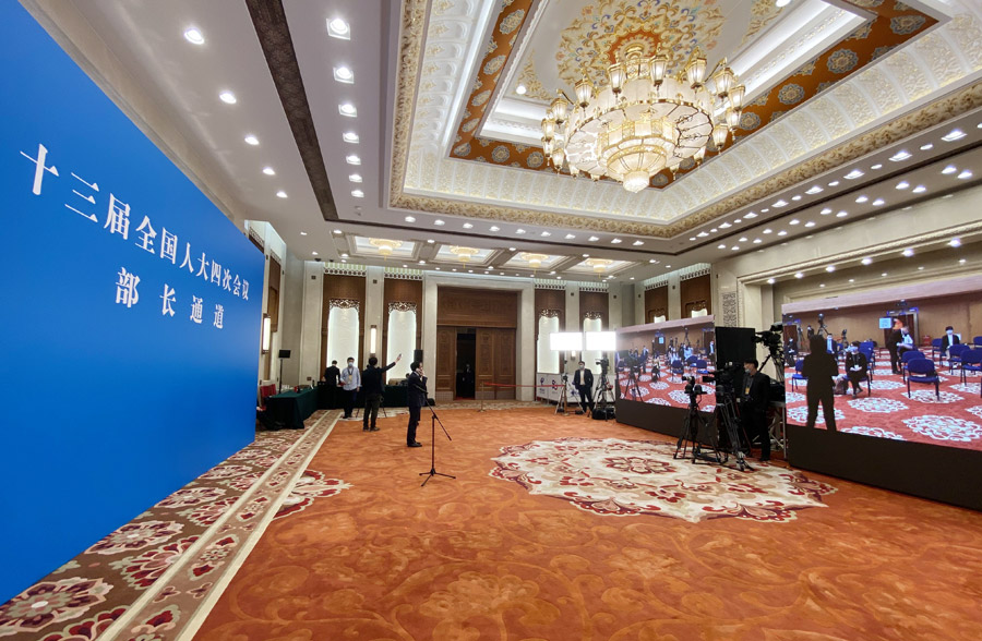 3月5日,十三屆全國人大四次會(hui) 議開幕會(hui) 結束後,舉(ju) 行首場“部長通道”采訪活動,邀請部分列席會(hui) 議的國務院有關(guan) 部委負責人通過網絡視頻方式接受采訪。圖為(wei) “部長通道”現場。新華網 王翰林 攝