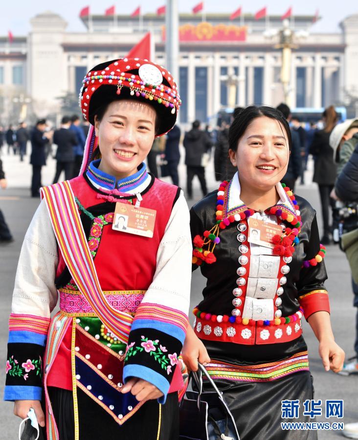 3月8日,十三屆全國人大四次會(hui) 議在北京人民大會(hui) 堂舉(ju) 行第二次全體(ti) 會(hui) 議。這是兩(liang) 位女代表走向會(hui) 場。新華社記者 賀長山 攝