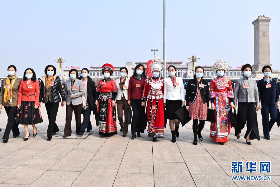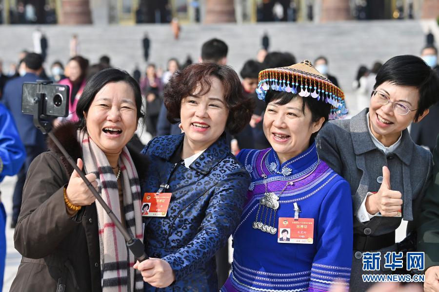 3月7日,全國政協十三屆四次會(hui) 議在北京人民大會(hui) 堂舉(ju) 行第二次全體(ti) 會(hui) 議。這是會(hui) 議結束後,政協委員夏寧、區捷、韋震玲、楊靜華(從(cong) 左至右)在人民大會(hui) 堂外合影。新華社記者 李鑫 攝