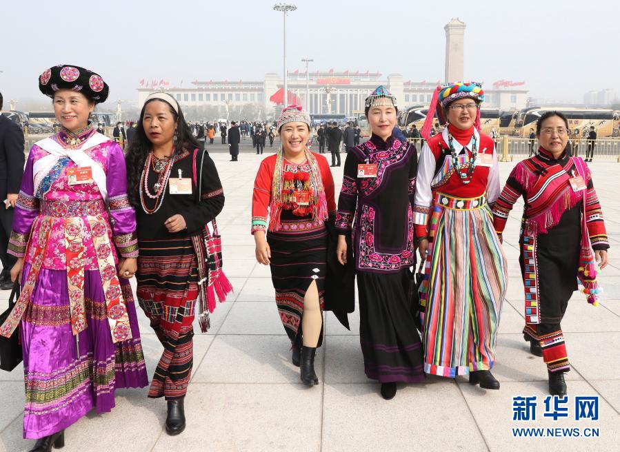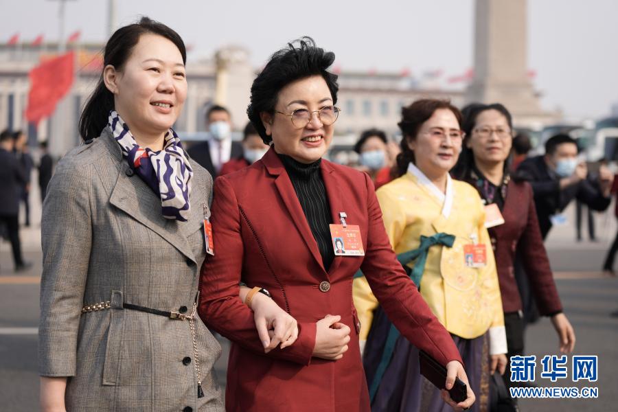 3月5日,第十三屆全國人民代表大會(hui) 第四次會(hui) 議在北京人民大會(hui) 堂開幕。這是女代表們(men) 走向會(hui) 場。新華社記者 李鑫 攝
