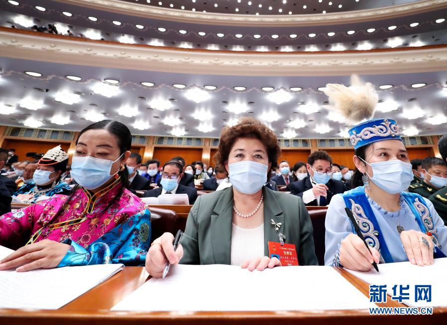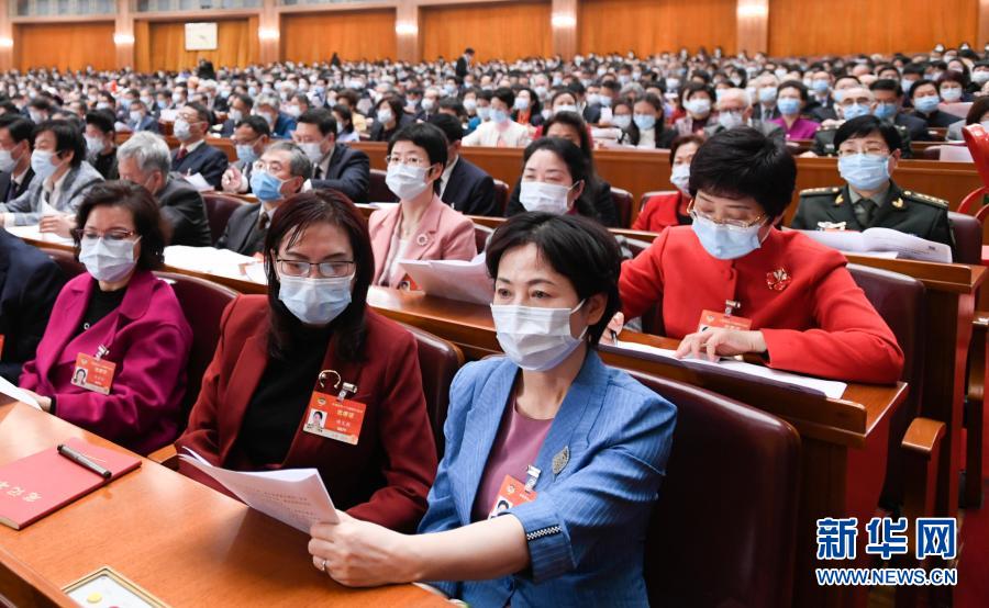 3月8日,十三屆全國人大四次會(hui) 議在北京人民大會(hui) 堂舉(ju) 行第二次全體(ti) 會(hui) 議。這是幾位女代表在認真聽會(hui) 。新華社記者 丁林 攝
